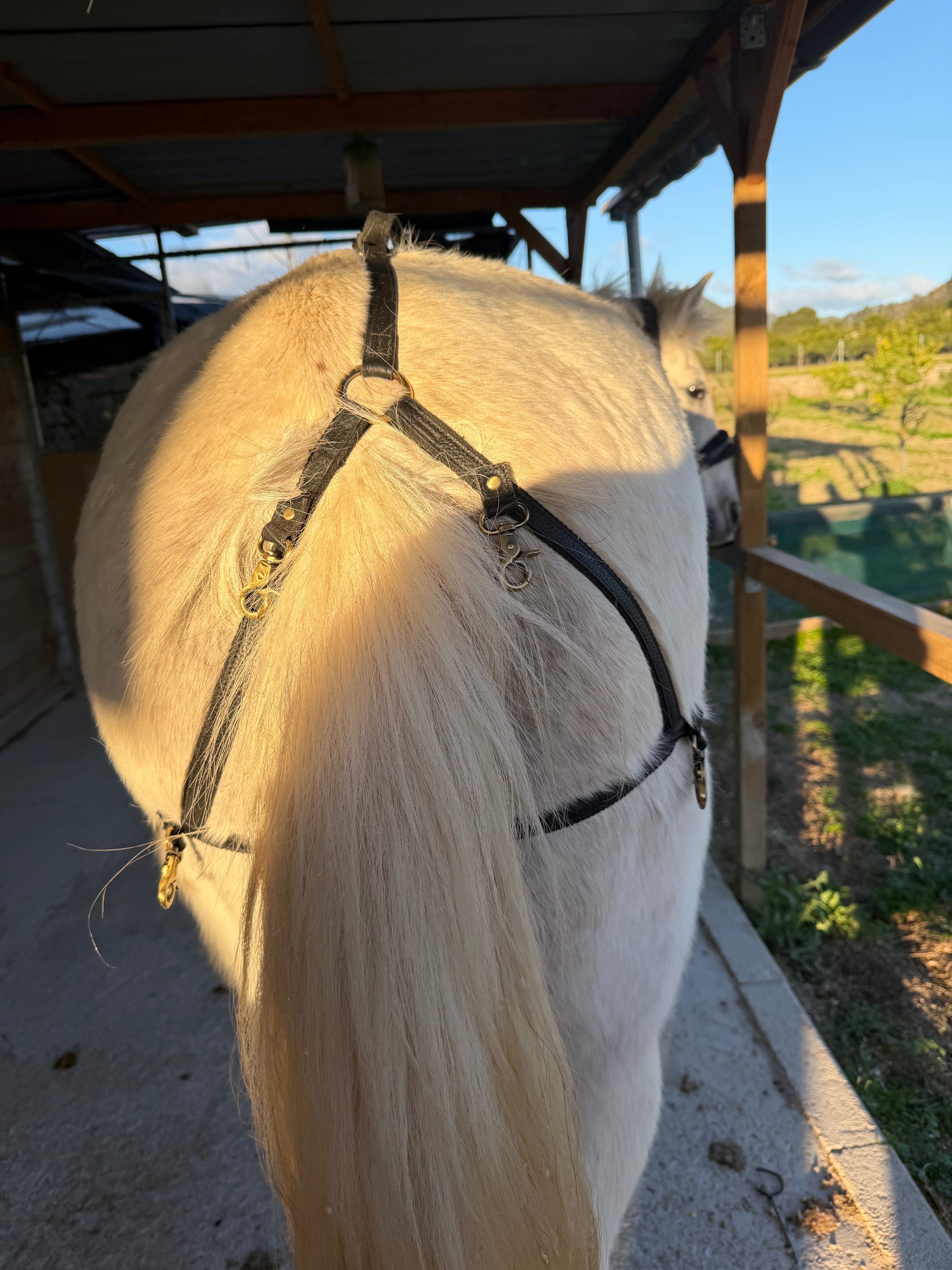 El arnés se adapta fácilmente a cada caballo. Las correas pueden ajustarse y, si sobra material, se puede cortar para dejarlo perfectamente adaptado a la medida del animal.